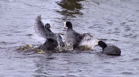 Het spel is op de wagen: met dit soort lenteachtige temperaturen raken de hormonen verhit en zijn overal paringsactiviteiten te zien, zoals bij deze meerkoeten in De Wilck.