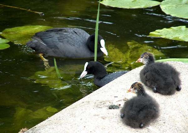 Eind mei 2003 loop ik langs deze vijver en zie dit leuke tafereeltje. De pullen zijn al wat ouder, ze zijn hun rode kopje al weer kwijt. Deze jongen zitten lekker in de zon en wachten totdat de ouders wat eetbaars komen brengen.
