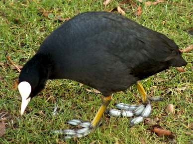 Als een meerkoet zwemt kan je zijn mooie poten niet zien.