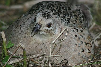 Een fazant waakzaam op haar nest
