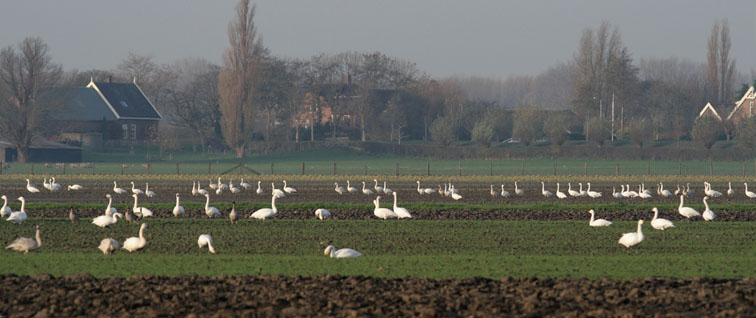 Het aantal kleine zwanen in de Benthuizer Noordpolder groeit nog steeds! Vanmorgen zaten er 305, waarvan 62 juveniele vogels, maar liefst 20%! Al eerder meende ik dit jaar veel kleine kleintjes te zien. Overigens zullen ze volgens mij niet zo lang meer in de BNP verblijven. Er lijkt mij namelijk niet zo veel voedsel. Misschien dat er nog een beetje bietenresten liggen, en verder moeten ze het doen met prille scheuten van akkerbouwproducten: wel lekker maar het schiet niet erg op. Bovendien moeten ze het schaarse voedsel delen met honderden ganzen: