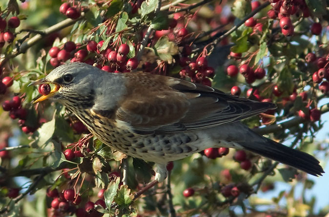 De instroom van onze noordelijke wintergasten is volop aan de gang. Veel smienten waren al eerder gearriveerd, de laatste dagen wemelt het ook ineens van de koperwieken en de kramsvogels. Koperwieken hebben een bescheiden roep, maar de grotere kramsvogels hoor je luid en duidelijk met hun tsjak-tsjak. Overal waar bessenstruiken zijn kan je ze op het ogenblik tegenkomen