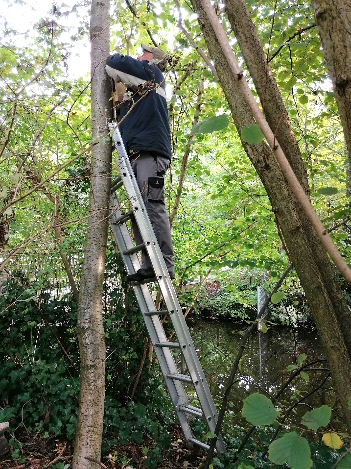 Aan de slagOp 18 oktober kwam het team van het nestkastbeheer weer bijeen in het Leiderdorpse park De Houtkamp om de ruim 70 nestkasten te contoleren, schoonmaken, repareren/vervangen en te administreren.,enwaren om half negen present bij het kantoor van het parkbeheer. Sjon en Ingeborg zijn beiden lid van de Vogelwerkgroep en Feiko is medewerker van het park. Na een bak warme koffie ging het team aan het werk, met een aangename temperatuur van rond de 15 graden en een wazig zonnetje. Dit zou zo de hele dag blijven. |